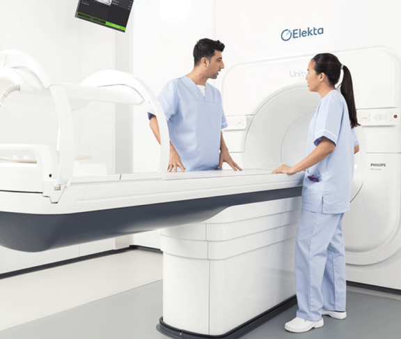 Elekta Unity combines a state-of-the-art 1.5T MRI with an advanced radiation delivery system. The MRI provides superior visualisation of the day-to-day changes in the anatomy which enables the clinical care team to reshape the radiation dose for every treatment to account for changes in shape and position of the tumour and surrounding healthy tissue. It ensures an accurate dose is delivered to the tumour, while minimising the radiation dose to healthy tissue and surrounding organs.